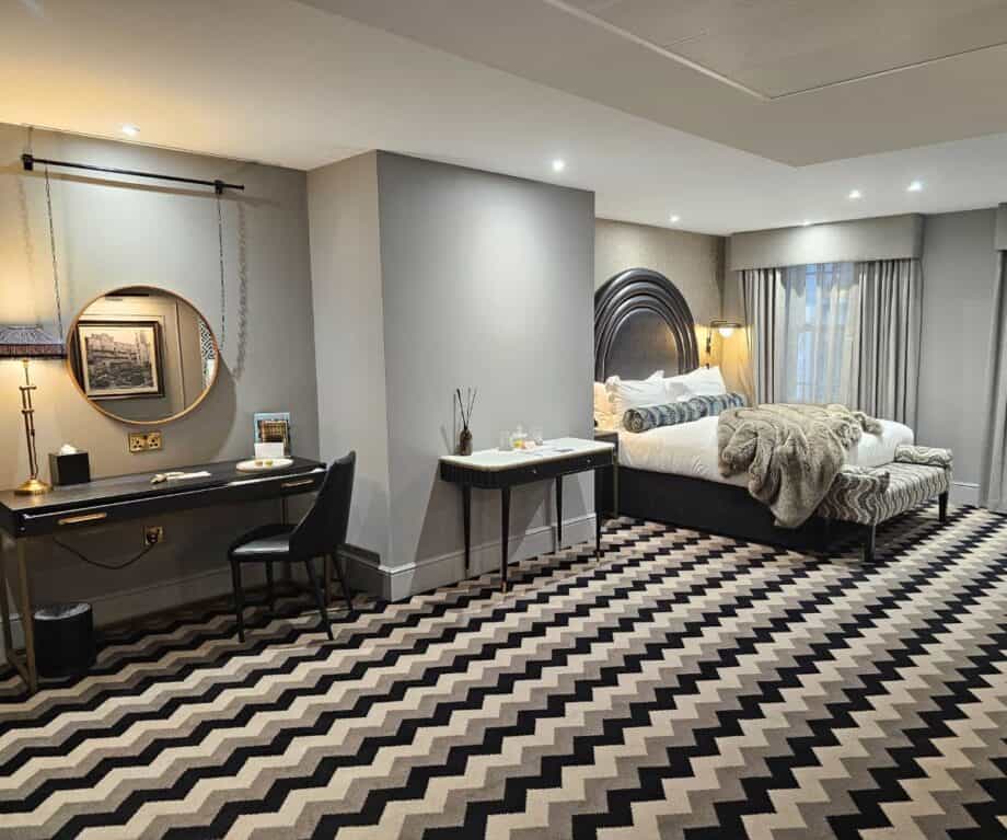 We stayed in one of the hotel’s Director Suites – room 50 on the second mezzanine – and were struck by the abundance of space upon entry, as well as the bold, patterned flooring and inviting palette. Such was the size of the room that, from afar, the vast bed looked deceptively modest.