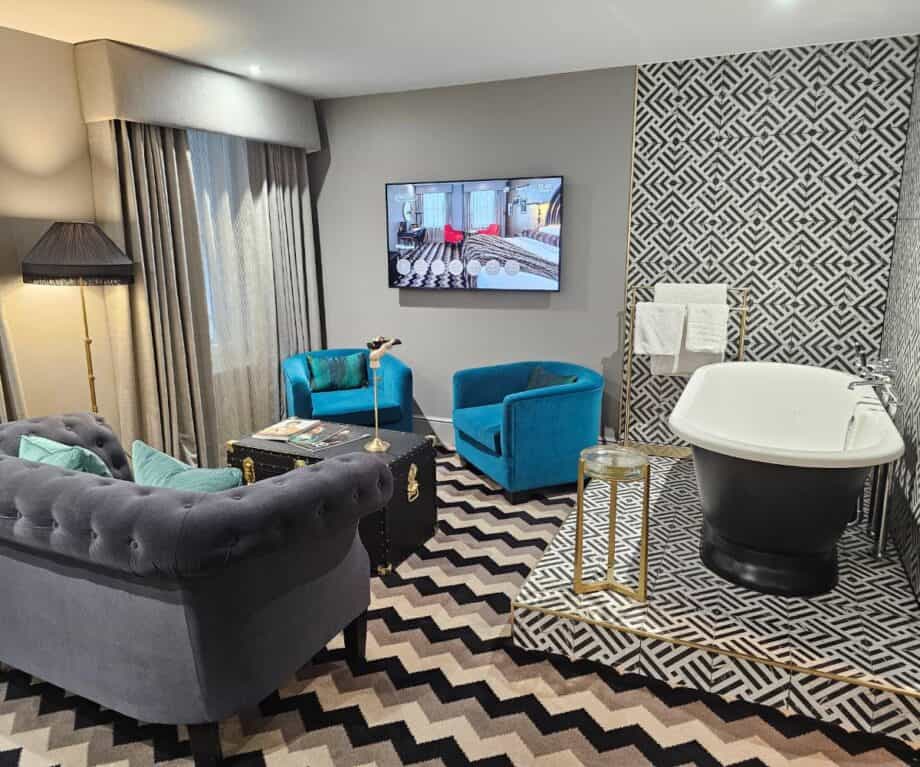 The suite’s built-in wardrobe cleverly conceals a well-stocked minibar (including local ‘Fire’ beer and complimentary Geordie “wata”), alongside a kettle with premium teas, coffee and hot chocolate, plus a selection of snacks available for purchase. Practical yet thoughtful extras like a safety deposit box, hairdryer and curated reading materials — from the hotel’s own Gotham Bugle to high-end magazines — round out the experience.