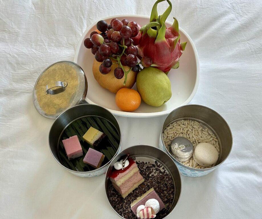 Upstairs, a fruit bowl and a cylindrical tiffin carrier await. Each tier reveals a small delight: colourful macarons, delicate petit fours and local cakes arranged with geometric precision.