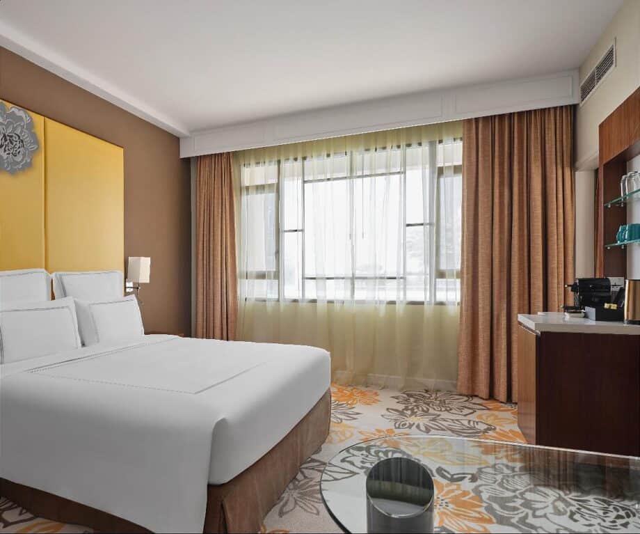 The room balances style with substance, ticking every box: coffee machine and kettle, fridge, a large wall-mounted screen offering a wide range of international channels, a spacious wardrobe, ample storage and evening turn-down service.