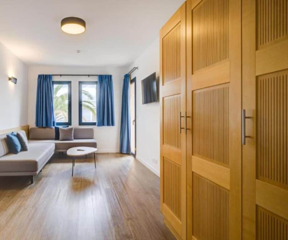 Just as we did last visit, we stayed in the aparthotel section of Playitas in a studio apartment — the kind of family-friendly layout the resort specialises in. The studios are open-plan with a kitchenette and sofa-bed so the lounge doubles as a second bedroom when needed – practical, airy and unpretentious.