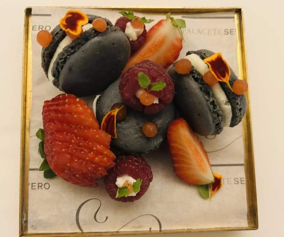 In our room, we are welcomed with a colourful selection of strawberries and petit fours, plus a brochure for the Palacete’s current art exhibition.