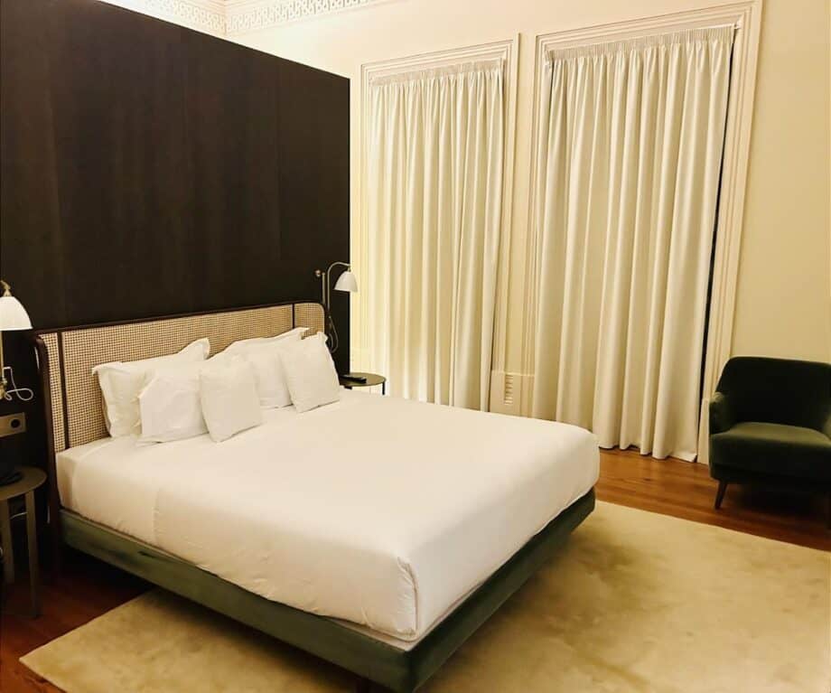 There is a sense of Severo’s optimism for Porto, as it entered the 20th century, in the high-ceilinged, oak floored rooms. A sturdy wicker headboard tops a wide bed dressed with high-thread count linens, creating a subtle feeling of understated grandeur.