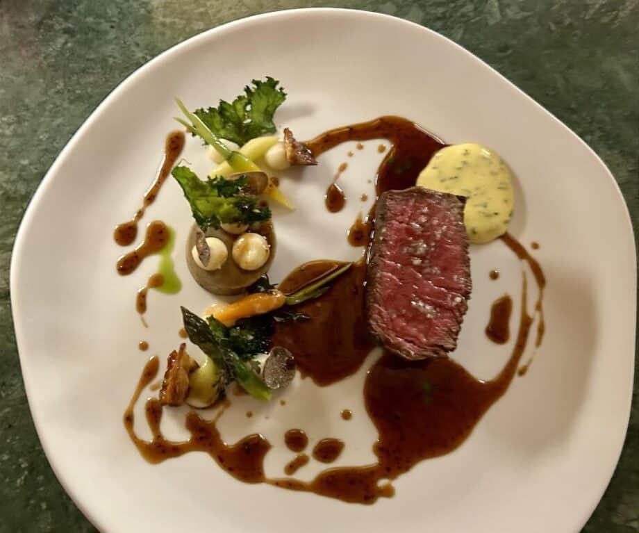 Alongside the Bistro’s full menu, a menu of the day offers two or three courses. Soups are beyond superlatives, especially fish which decadently edges towards a lobster bisque. Whilst the fish of the day is accompanied by sautéed potatoes, seasonal vegetables and a white-wine butter sauce.