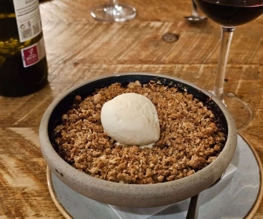 We felt we’d burned off enough calories that weekend that we could afford to share a seasonal crumble rich in damsons and served with ice cream.